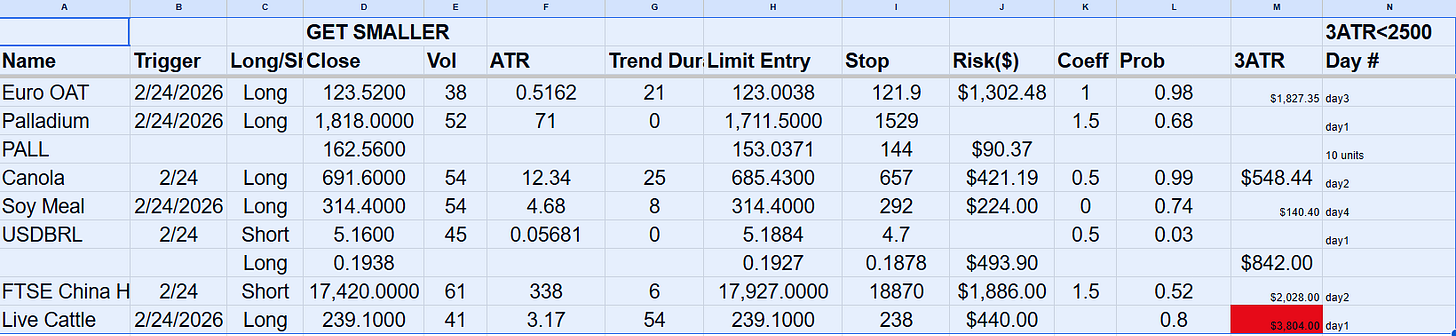 New orders: long Euro OAT, long PALL, long Canola, long Soy Meal, long BRE, short FTSE China H50 and long Live Cattle.