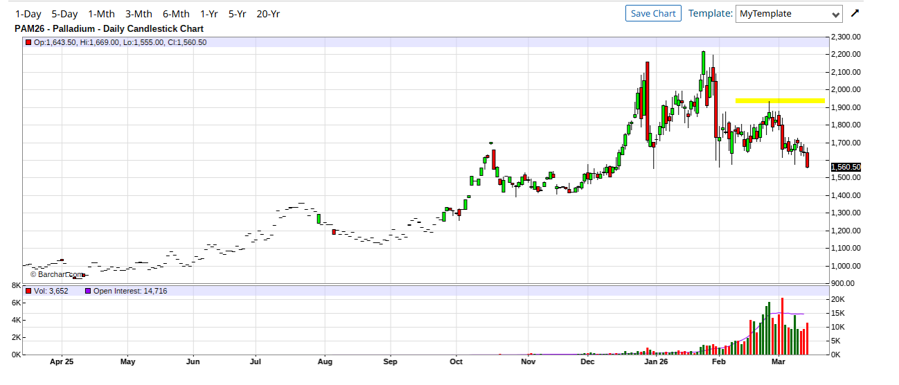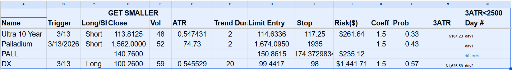 Short PalladiumWellshillMar 15, 2026ShareNew SignalsTrade ManagementLong Soy Meal filled at 317.8 and the new stop level is 311.New orders: short Ultra 10 year, short PALL, long DX and short Mexico IPC.Goal SettingGet smallerTake all signalsLeading groups: short bonds and long dollarReset into strength